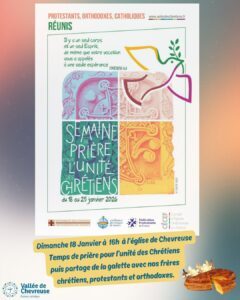 Nous vous proposons dimanche 18 janvier à partir de 16h dans l’église de Chevreuse, un temps de prière œcuménique puis le partage de la galette des rois avec nos frères chrétiens protestants et orthodoxes.